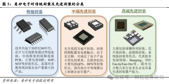 以是否使用引线框架来区分传统封装与先进封装。参考甬矽电子招股说明书资料,其将传统封装定义为“芯片与引线框架通过焊线连接,引线框架的接脚连接PCB”,将中端先进封装定义为“无引脚,封装四侧配置有电极触点”,将高端先进封装定义为“球栅阵列封装等技术”。传统与先进封装的一个主要差异在于与外界的连接方式,DIP类通过引线框架分布在两侧的引脚;QFN类无引脚,通过四侧的扁平电极触点连接;其他高端先进封装则通过封装基板上的焊球等材料互连,连接点可布满整个底面。考虑封装技术的发展趋势,我们以是否使用引线框架来区分传统封装与先进封装,将使用引线框架的归类为传统封装。