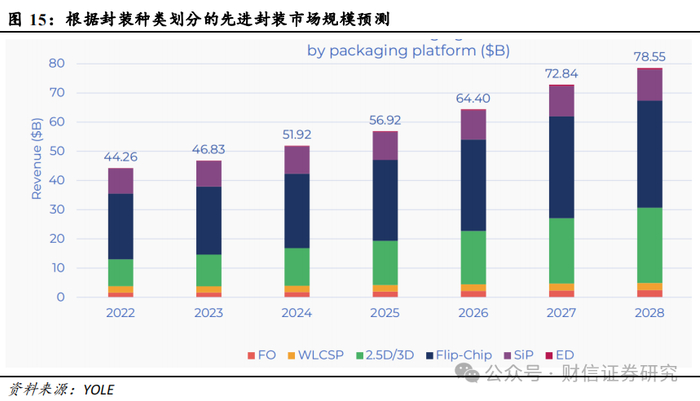 后摩尔时代,先进封装持续演绎。封装是连接芯片内部世界与外部世界的桥梁,为芯片提供机械保护、电气连接、机械连接和散热等功能。随着摩尔定律放缓,以及“存储墙”、“面积墙”和“功耗墙”等的制约,先进封装逐渐成为集成电路发展的关键路径和突破口,以FCBGA、SiP、FOPLP、Chiplet、2.5D/3D为代表的先进封装成为延续摩尔定律及推动产业发展的重要环节。预计未来先进封装有望具备高价值、高增长的特征。据YOLE数据,先进封装有望以约5%的数量支撑超过50%的封装市场规模。2022-2028年,全球封装市场规模有望从950亿美元增长至1433亿美元,CAGR为7.1%;其中先进封装市场规模有望从443亿美元增长至786亿美元,CAGR为10.0%。