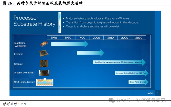 玻璃基板有望成为下一代封装基板。英特尔2023年宣布在用于下一代先进封装的玻璃基板开发方面取得重大突破,这一“里程碑式的成就”将重新定义芯片封装的边界,能够为数据中心、人工智能和图形构建提供改变游戏规则的解决方案。封装基板的发展已经历经了引线框架/线键合、陶瓷基板、有机基板以及嵌入式有机基板四个阶段,目前有机基板因其成熟度及成本优势成为主流的基板。英特尔认为,主要的基板技术大约每15年发生一次转变,有机基板向玻璃基板的转变有望在2020-2030年之间发生,但有机基板与玻璃基板会长期共存。