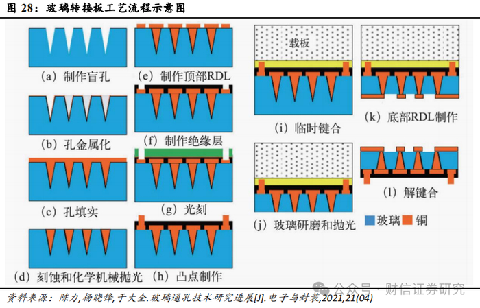 发展玻璃基板的关键技术包括玻璃通孔成孔、通孔填充、高密度布线。玻璃通孔(Through Glass Via,TGV)技术是实现玻璃基板垂直电气互连的关键技术,主要环节包括玻璃通孔成孔、填充与布线。1)玻璃通孔成孔,需要满足高速、高精度、窄节距、侧壁光滑、垂直度好以及低成本等一系列要求,典型的通孔成孔工艺包括聚焦放电法、等离子刻蚀法、激光烧蚀法、电化学放电法、光敏玻璃法、激光诱导刻蚀法等,激光诱导玻璃改性优势较为明显,成孔快,可制作高密度、高深宽比的玻璃通孔,玻璃通孔无损伤。2)通孔填充,玻璃表面平滑,与常用金属(如Cu)的黏附性较差,容易造成玻璃衬底与金属层之间的分层现象,导致金属层卷曲甚至脱落等现象。3)高密度布线,相对于有机衬底而言,玻璃表面的粗糙度小,在高密度布线上具备优势。但半加成工艺法在线宽小于5μm的时候会面临许多挑战,例如在窄间距内刻蚀种子层容易对铜走线造成损伤且窄间距里的种子层残留易造成漏电。玻璃基板产业目前还存在高深宽比TGV黏附层及种子层制备、电镀填充,工艺技术路线、装备材料、应力问题、可靠性问题、良率问题、成本问题等诸多挑战,仍需要产业协同建立畅通的供应链,共同努力攻克诸多难题。