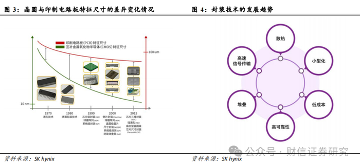 特征尺寸差异扩大是封装发展的动力之一。20世纪70年代,印制电路板与晶圆的特征尺寸差异较小。随着晶圆制造技术的持续发展,其特征尺寸已进入10nm以内,而印制电路板的特征尺寸仍在100微米级别。两者特征尺寸的差距在过去几十年里显著扩大。由于芯片需要通过封装安装在印制电路板上,因此封装需要弥补印制电路板和晶圆之间的尺寸差距。当两者特征尺寸差异不大时,可以使用双列直插式封装(DIP)或锯齿型单列式封装(ZIP)等引线框架封装。随着差异的不断扩大,先是发展到薄型小尺寸封装(TSOP)等表面贴装技术(SMT),随后球栅阵列(BGA)、倒片封装、扇出型晶圆级芯片尺寸封装(WLCSP)及硅通孔(TSV)等封装技术相继问世,以弥补晶圆和主板之间不断扩大的尺寸差异。