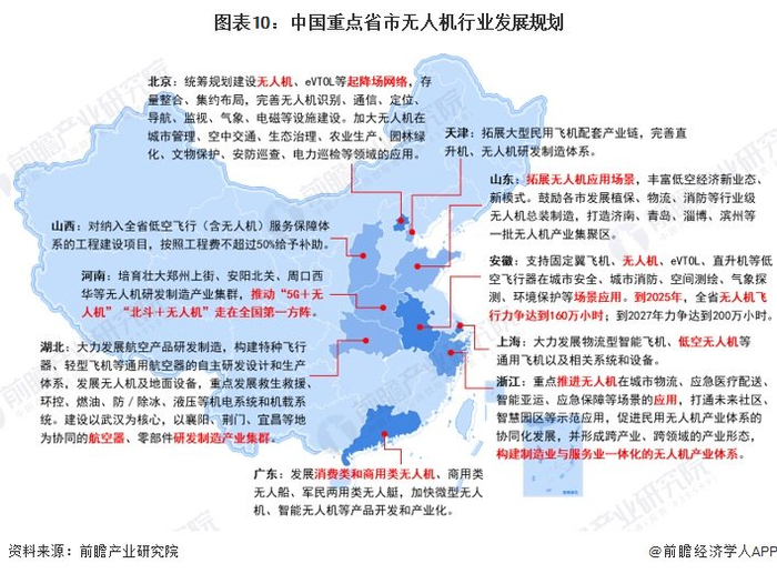 “十四五”期间,我国主要省份也提出了无人机行业的发展目标,广东省提出发展消费类和商用类无人机,加快微型无人机、智能无人机等产品开发和产业化;上海提出大力发展物流型智能飞机、低空无人机等通用飞机以及相关系统和设备;浙江、安徽、山东等省市则重点关注基础设施建设及应用场景拓展。其他省市也对无人机行业作出了相应的规划: