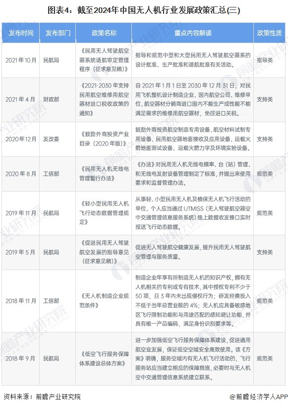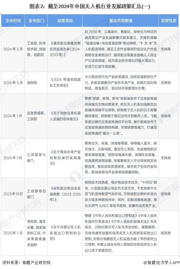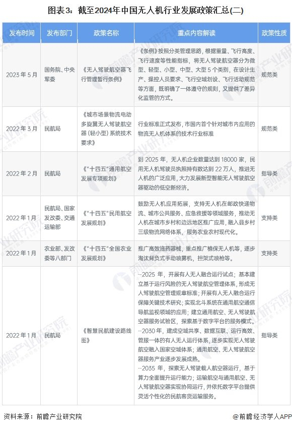 近年来,国家先后发布了《中国制造2025》《“十四五”民用航空发展规划》《通用航空装备创新应用实施方案(2024-2030年)》等政策,明确指出要推进无人机产业化,完成无人驾驶航空运行顶层设计,建立并完善法规标准体系,统筹开展试点示范运行,鼓励无人机应用场景拓展,大力发展新型智能无人驾驶航空器驱动的低空新经济。