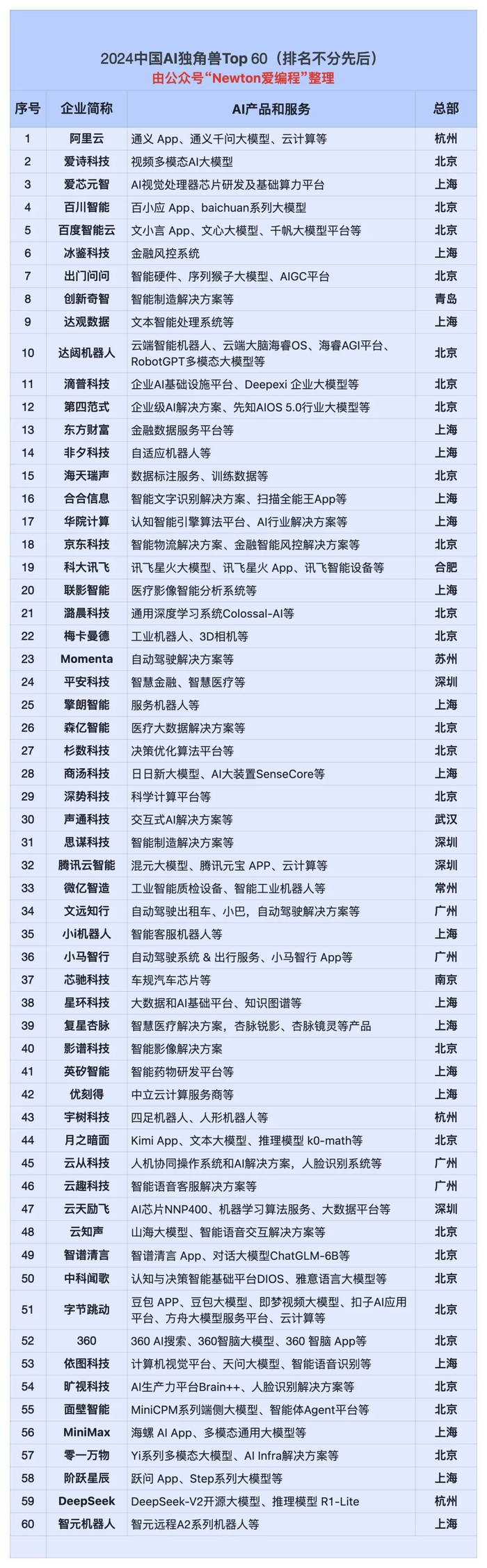 中国AI独角兽Top60榜单