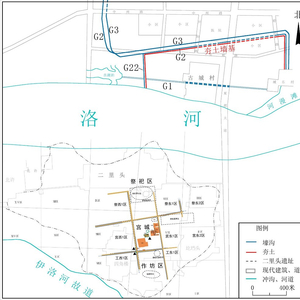 其中,G2、G3、夯土墙大致平行,均位于古城村遗址东、北部。已发现的部分均呈拐尺形,均包括西南-东北走向和南北走向的部分。西南-东北走向部分长度超过1800米,南北走向部分长度超过300米。
