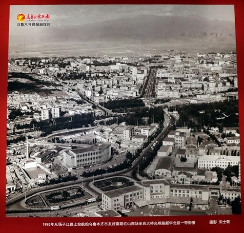 乌鲁木齐市博物馆展出的1985年从扬子江路上空航拍乌鲁木齐市友好南路红山商场至西大桥光明路新华北路一带的街景。记者王畅彤摄