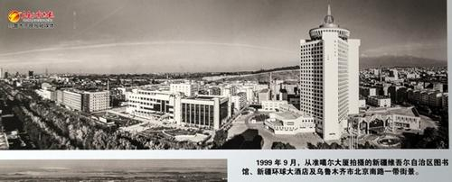 乌鲁木齐市博物馆展出的1999年9月,从准噶尔大厦拍摄的新疆维吾尔自治区图书馆、新疆环球大酒店及乌鲁木齐市北京南路一带街景。记者王畅彤摄