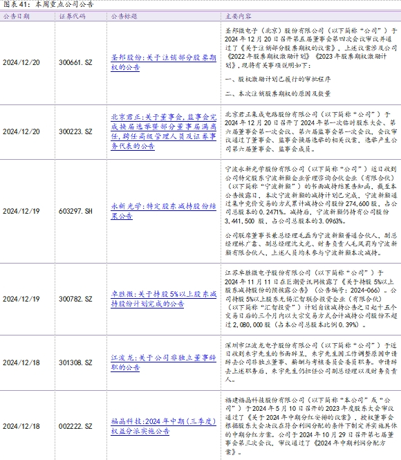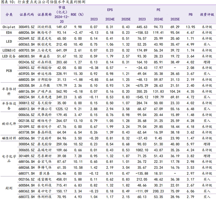 12月16日-12月20日当周,重点关注公司周涨幅前十:数字IC占4席,封测、模拟IC、LED、通信工程及服务、光刻胶、PCB各占1席。乐鑫科技(数字IC)、兆易创新(数字IC)、瑞芯微(数字IC)包揽前三,周涨幅分别为23.02%、21.75%、20.97%。