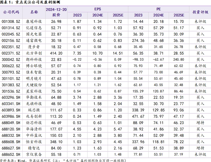 受益于上游头部供应商减产以及2023年第四季度消费电子市场有所恢复,存储芯片价格整体呈现回升趋势。NAND方面:Wafer:512GbTLC现货平均价从2023年7月底开始回升,随后从2024年3月底进入下降态势,2024年12月9日价格为2.44美元。DRAM方面:DRAM:DDR4(8Gb(512Mx16),3200Mbps)现货平均价从2023年9月中旬开始持续上涨,2024年3月以来价格略有下滑,6月之后呈现小幅回升态势,9月之后又重回下跌态势,2024年12月20日价格为1.55美元。
