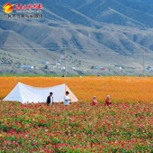 在乌鲁木齐县萨尔达坂伴山花田,游客在赏花观景游玩。资料图片