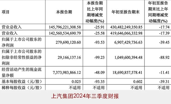 财务数据上,2024年前三季度,上汽集团实现收入4304.82亿元,归母净利润69.07亿元。此外,在上汽集团发布的2024年半年度业绩报告中,上半年,上汽集团营收2846.9亿元,同比下降12.8%;股东净利润为66.3亿元,同比下降6.5%。