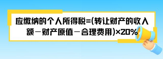 《中华人民共和国个人所得税法》规定,财产转让所得,以转让财产的收入额减除财产原值和合理费用后的余额为应纳税所得额,按照20%的税率计算应当缴纳的个人所得税。