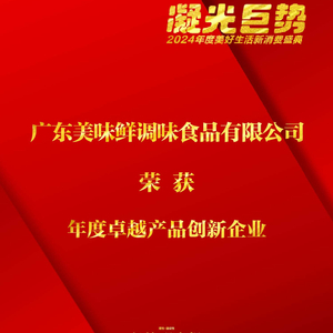近日,在刚刚落幕的“凝光巨势・2024 年度美好生活新消费盛典”上,广东美味鲜调味食品有限公司(以下简称“美味鲜”)凭借其卓越的产品创新能力,从数百家参评企业中脱颖而出,荣获“年度卓越产品创新企业”称号。这一奖项不仅是对美味鲜过去努力的认可,更是对其在未来持续创新发展的激励。