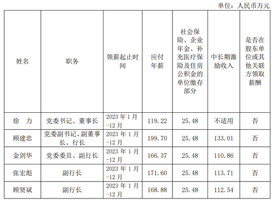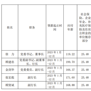 此外,上海农商银行党委书记、董事长徐力年薪为 119.22 万元,无中长期激励收入。党委委员、副行长金剑华年薪 166.37 万元;副行长张宏彪为171.60 万元;副行长顾贤斌为168.88 万元;副行长应长明为 172.18万元,上述四者均有100余万元的中长期激励收入。