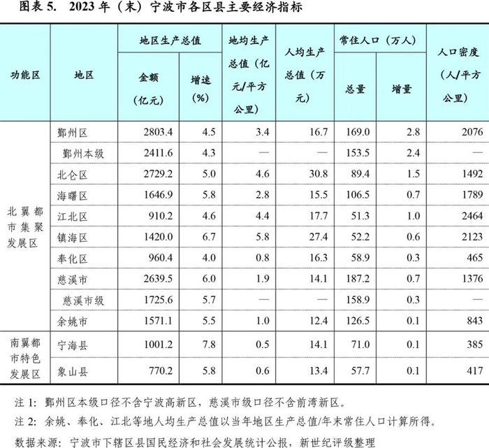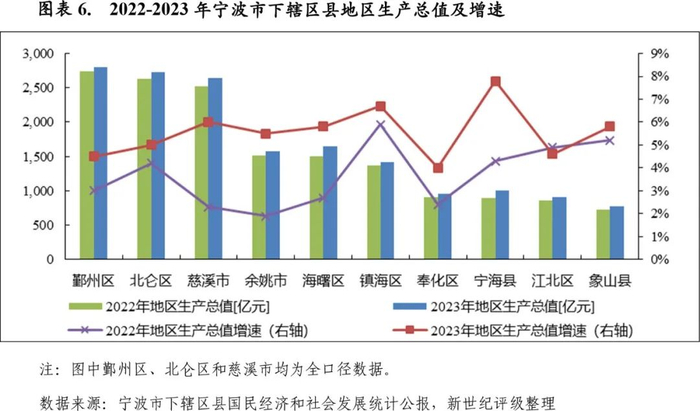 宁波市区县经济发展水平总体较高,城乡差距相对较小,下辖十个区县中鄞州、北仑、海曙和镇海四区以及慈溪、余姚两市2023年经济总量继续超千亿元,并新添千亿级GDP成员宁海县。其中,鄞州、海曙两区处于市域地理相对中心位置,是全市中央活动区(三江口、东部新城、南部新城)所在地,经济发展以服务业为主导,2023年三产占比居全市前两位;北仑区、慈溪市、余姚市及镇海区工业经济相较发达,2023年四地集聚了全市约六成的第二产业增加值,也是全市主力培育的绿色石化、汽车、智能家居等工业产业集群主要承载地,其中北仑区、慈溪市两地规上工业增加值超千亿元,镇海区近千亿元,余姚市工业经济体量相对居后;南翼地区宁海县二三产业发展并重,已形成“光伏+储能”“文体+办公”“模具+新能源汽配”三大主导工业产业体系,2023年GDP首超千亿元,但地均生产总值及人口密度与象山县相近,均居全市下游。奉化、江北两区和象山县也具备一定经济规模。其中后设区的奉化区地均生产总值及人口密度居六大城区末位,经济结构中工业发展相对领先,2023年二产占比超60%;江北区属面积较小的老城区,由工业区转型为滨水居住区,是三江口核心区及城市副中心姚江新城所在地,重点发展服务业,2023年三产占比超65%;象山县经济结构中以海洋渔业为主导的第一产业增加值占比市内最高(13.0%),工业以建筑业、针纺织业、汽模配、临港装备、绿色能源和功能材料等为主导,并发展滨海旅游、影视产业等特色服务业,是全市经济总量最小的县。