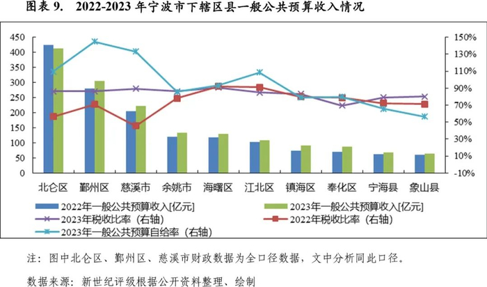 [3] 宁波市下辖区县财政及债务数据根据公开资料整理,本报告以尽可能统一口径的数据进行分析,但不排除相关指标计算及可比性仍存在一定瑕疵。北仑区、鄞州区、慈溪市财政收入分全口径和本级口径。