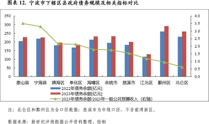 以2023年末政府债务余额与当年一般公共预算收入相比,象山、宁海两县该比值超3倍,仍居全市该比值降序排列前两位,当年两县均获市级转贷的特殊再融资债券额度,有助于化解地方政府债务风险。次之的镇海、奉化两区该比值略超2倍。江北、鄞州、北仑三区该比值低于1.5倍,其中北仑区该比值为0.6倍,居全市末位。海曙区和余姚、慈溪两市该比值略高于1.5倍。