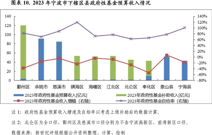 从政府性基金预算收入对支出覆盖情况看,2023年宁波市下辖区县政府性基金预算自给能力总体较强。考虑上级补助后,2023年镇海区、宁海县政府性基金预算收入及相关补助基本能覆盖相应支出;鄞州、江北两区、慈溪市、象山县2023年政府性基金预算自给率超75%;其余区县中仅奉化、北仑两区政府性基金预算自给率低于70%。