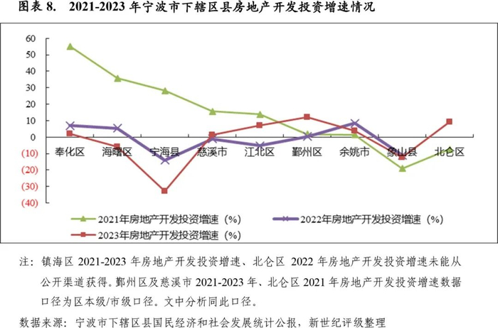 固定资产投资方面,2023年宁波市下辖区县固定资产投资增速走势存在分化,其中慈溪市、宁海县2023年投资增速基本与上年持平,均超全市平均水平(7.5%),主要由基础设施投资高增带动。镇海区、象山县2023年投资增长明显提速,增速均超15%,主要系工业投资及基础设施投资双高增拉动。海曙区、余姚市、江北区、北仑区、奉化区2023年投资增长放缓,其中余姚市投资增幅仍超全市平均水平,增幅走低主要系受工业投资及房地产开发投资增幅回落所致;海曙区投资转为负增长,增速居全市末位,主要系工业投资及房地产开发投资均下行所致;江北、北仑两区投资增速放缓分别主要系上年基础设施投资增幅自高位回落、工业投资负增长所致;奉化区投资增速连年走低,2023年该地二产投资、基础设施投资及房地产开发投资增幅均回落至低位。