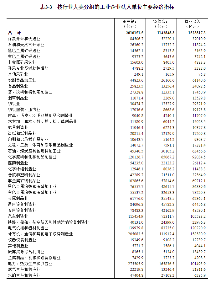 在工业企业法人单位从业人员中,采矿业469.8万人,制造业10481.4万人,电力、热力、燃气及水生产和供应业477.6万人,分别占4.1%、91.7%和4.2%。在工业行业大类中,计算机、通信和其他电子设备制造业,电气机械和器材制造业,通用设备制造业从业人员数位居前三位,分别占9.2%、7.1%和7.0%(详见表3-2)。