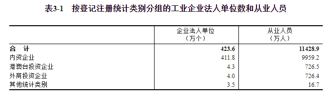 在工业企业法人单位中,内资企业411.8万个,占97.2%;港澳台投资企业4.3万个,占1.0%;外商投资企业4.0万个,占0.9%。