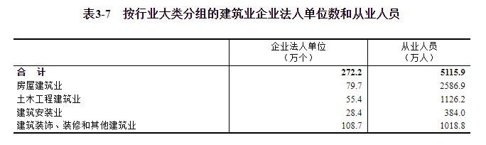 2023年末,全国共有建筑业企业法人单位272.2万个,比2018年末增长123.5%;从业人员5115.9万人,比2018年末下降11.9%。