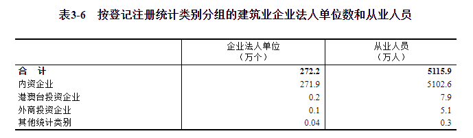 建筑业企业法人单位中,内资企业271.9万个,占99.9%;港澳台投资企业0.2万个,占0.1%;外商投资企业0.1万个,占0.03%。