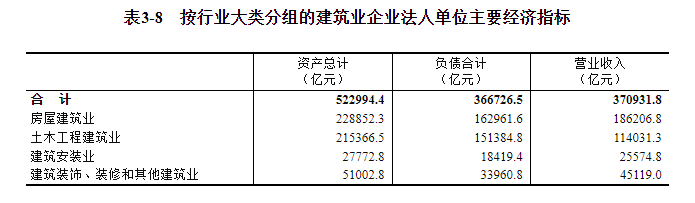 2023年末,建筑业企业法人单位资产总计522994.4亿元,比2018年末增长52.8%;负债合计366726.5亿元,比2018年末增长64.4%。