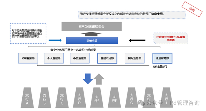 通常在银行实务中,内部资金转移定价最高决策机构为资产负债管理委员会(ALCO),该委员会下设定价小组,由管理内部转移定价系统的部门成员(通常为计划财务部)牵头,并与其他业务部门或条线的利率负责人构成,其中牵头成员负责日常曲线及价格发布。并是通过设立“定价联系人制度”定价协商小组与分支行内部定价负责人进行沟通,了解业务实际开展情况,确保FTP方案的运行情况并及时反馈至定价小组牵头成员。