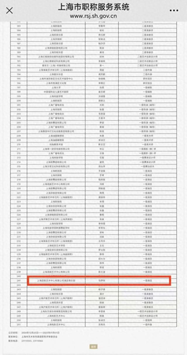 12月25日,上海市职称服务系统发布《2024年度上海市艺术系列高级职称评审委员会评审通过人员名单公示》,知名女演员马伊琍获得国家一级演员正高职称。