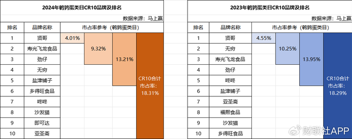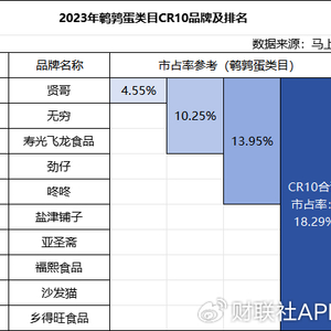 马上赢数据显示,今年,鹌鹑蛋零食CR10仅18.31%,同比2023年微增0.02个百分点。排名第一的贤哥,市占率从去年的4.55%缩窄至4.01%,排名第八位的沙发猫,其市占率不足1%,三只松鼠(300783.SZ)、百草味等众多知名零食品牌,未能挤进前十。