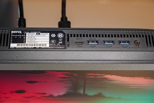 接口方面,与常规显示器不同的是明基PD2706QN的视频接口采用了背插设计,这样的好处显然是方便用户插拔线材,但对于显示器靠墙用户就不那么友好了。明基PD2706QN背面拥有一个HDMI2.0、一个DP1.4以及三个Type-C接口,其中有一个C口还支持90W的反向供电,通过C口传输视频信号时能够为笔记本进行供电,而在显示器底部,明基PD2706QN还拥有一个Type-C以及三个USB-A接口,四个接口均支持USB3.2Gen 1协议,使用一线通连接显示器的时候能够借用显示器作为Hub连接鼠标、键盘等外置设备,不占用笔记本接口。