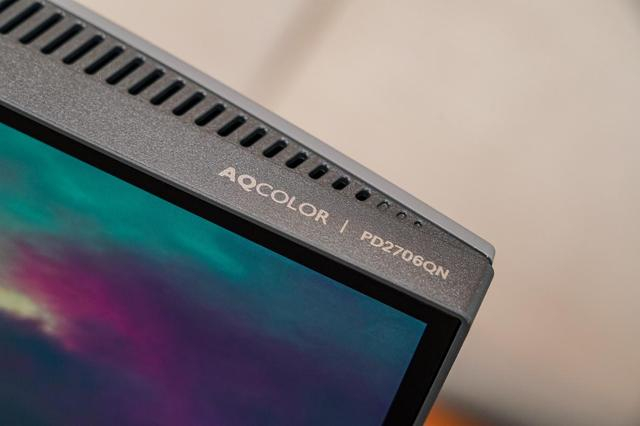 而在显示器顶部,同样有着产品型号及AQCOLOR的标识,这标志着这款显示器同样支持AQCOLOR色彩调校技术,保证用户开箱即用。