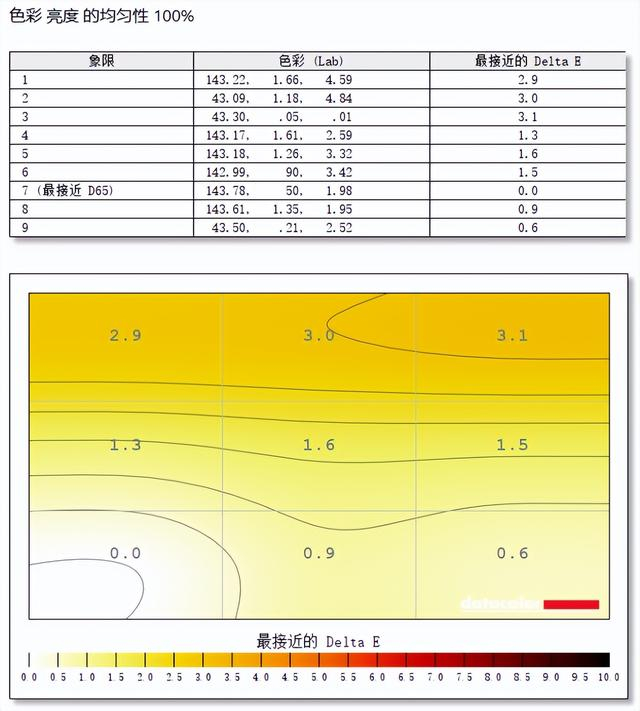 在色彩均匀性的测试中,明基PD2706QN显示器的第7象限最接近D65的标准,显示器右边第3象限与标准色温差值最大,不过也只有3.1,整体色彩均匀度表现尚可。