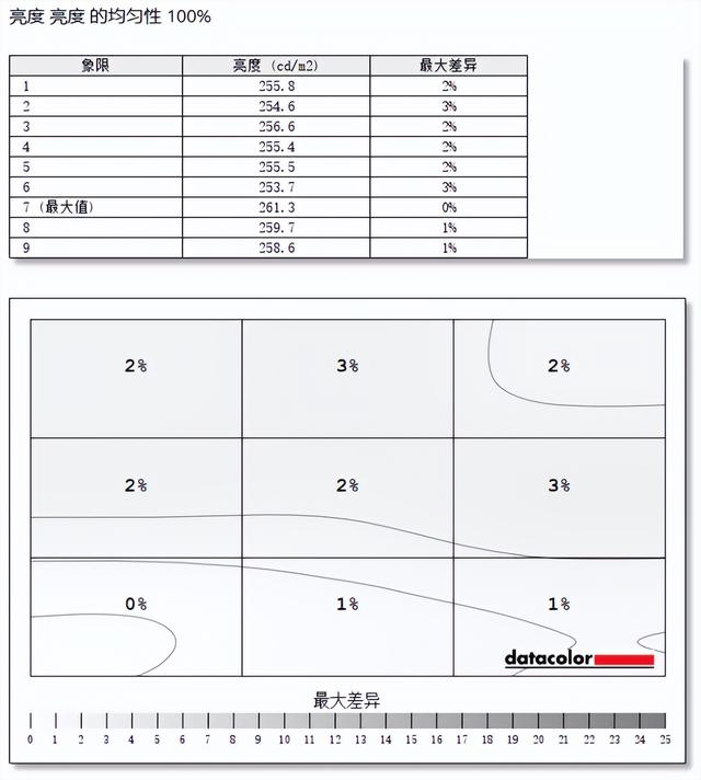 亮度均匀性的测试中,明基PD2706QN显示器整体表现更加优秀,亮度最大为第7象限,最大差异在第6象限,差值为7.6cd/m²。