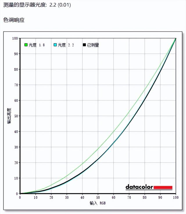 色调响应方面,已测量的黑色曲线应该尽量和浅蓝色的“光度2.2”曲线保持一致,可以看到实测的黑色曲线和“光度2.2”非常接近,色调响应表现不错。