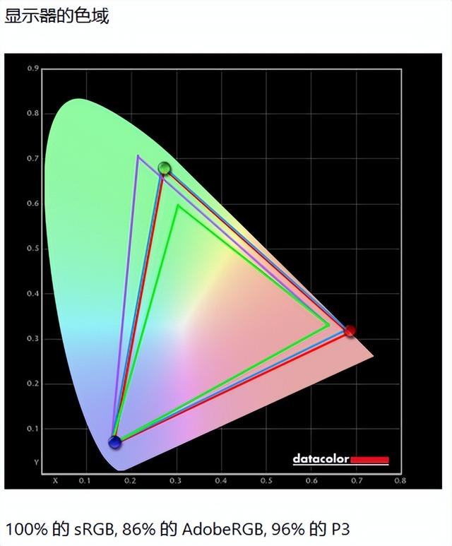 首先是色域测试,根据SpyderXElite软件的测试结果显示,明基PD2706QN显示器sRGB色域的覆盖度为100%,AdobeRGB色域的覆盖度为86%,P3色域的覆盖度为96%,表现符合官方宣传水平。