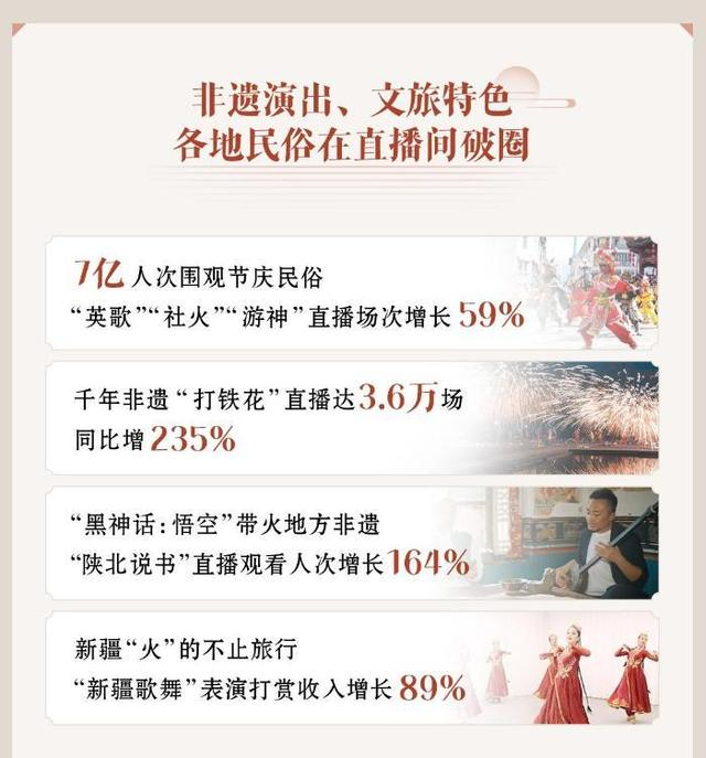 直播间里不乏此类文旅特色、非遗民俗“火出圈”。《报告》显示,过去一年,“打铁花”表演直播场次达3.6万场,同比增长235%。热门游戏“黑神话:悟空”则带动地方非遗演出走红。游戏中配乐唱段“陕北说书”类直播的观看人次增长164%。