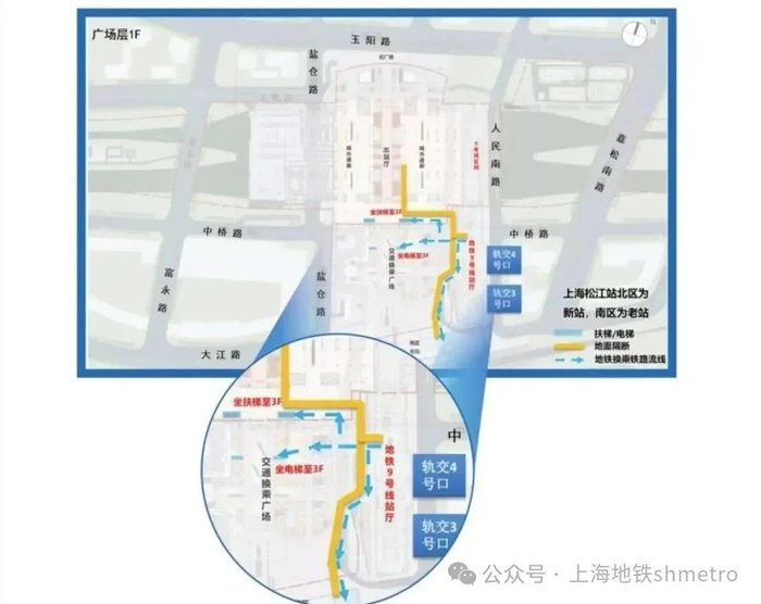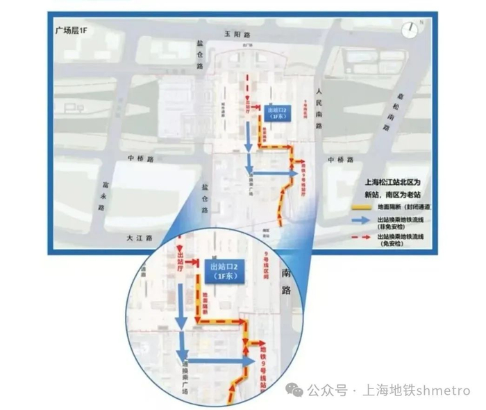 铁路换乘地铁的乘客可从铁路上海松江站南、北区出站点出站后,经地面一体化安检通道通行至地铁9号线上海松江站站4号口进站。