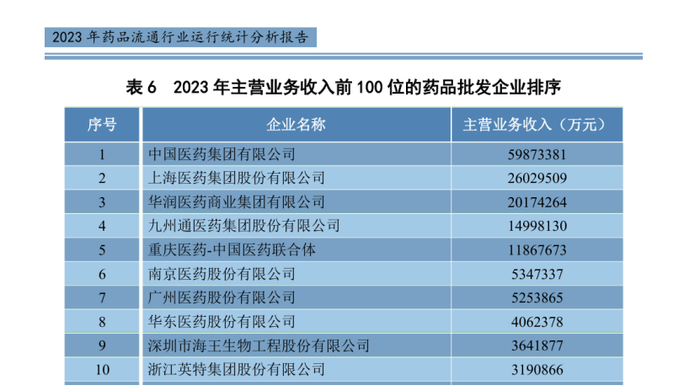 几大巨头,地位已基本稳固。商务部在11月发布的《2023年药品流通行业运行统计分析报告》显示,全行业已形成1家年销售规模超5000亿的超级巨无霸——国药;4家超1000亿元的大型药品流通企业,上药,华润医药商业,九州通,以及重庆医药-中国医药联合体。5家企业,占全国医药市场总规模半壁江山。