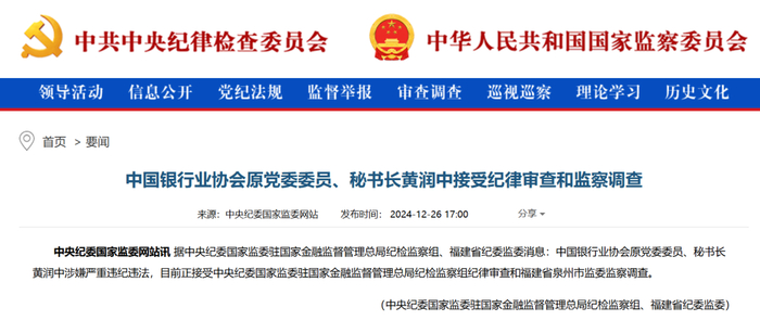 12月26日,中央纪委国家监委官网通报:中国银行业协会原党委委员、秘书长黄润中涉嫌严重违纪违法,目前正接受中央纪委国家监委驻国家金融监督管理总局纪检监察组纪律审查和福建省泉州市监委监察调查。