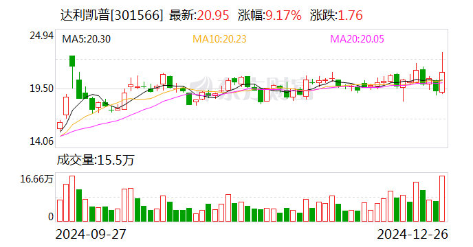 达利凯普(SZ301566,收盘价:20.95元)12月26日晚间发布公告称,公司限售股份约1134.83万股将于2024年12月30日解禁并上市流通,占公司总股本比例为2.84%。