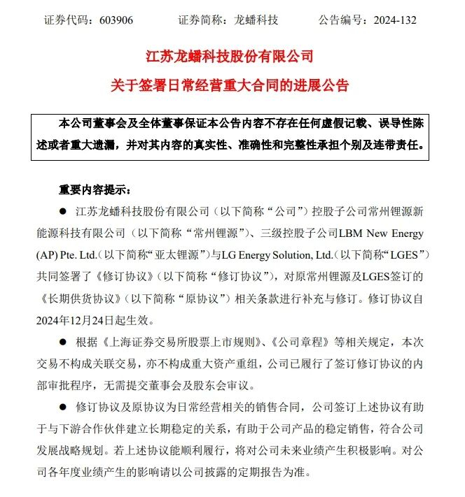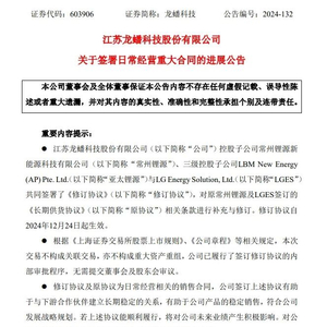 12月24日晚间,上市宁企龙蟠科技(603906.SH)发布公告称,其旗下控股子公司常州锂源及亚太锂源与韩国LG新能源修订了双方于今年2月签署的《长期供货协议》。