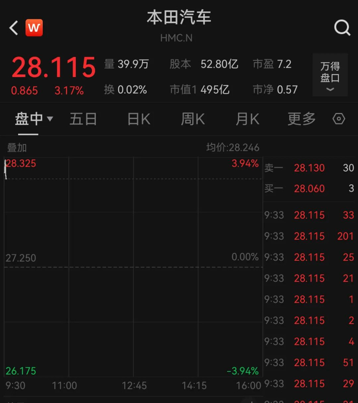 个股方面,周四开盘,本田(HMC.US)大涨,截至北京时间22:33,涨3.17%,报28.115美元/股。消息面上,12月23日,日本汽车制造商本田汽车和日产汽车签署了一份谅解备忘录,正式启动合并谈判。在接下来的六个月里,两家公司将讨论将业务合并为一家控股公司,预计将于2025年6月签署最终协议,并计划于2026年8月完成合并。合并后,新控股公司将成为全球销量第三大的汽车制造商。