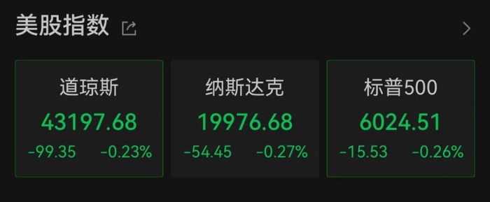 当地时间周四,美股三大股指开盘小幅下挫。截至北京时间22:33,道指跌0.23%,标普500指数跌0.26%,纳指跌0.27%。