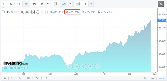 12月26日,印度卢比汇率再度跳水,卢比兑美元汇率一度跌至85.497的历史低点,现报85.283。这是卢比兑美元汇率连续第三个交易日创下历史新低。