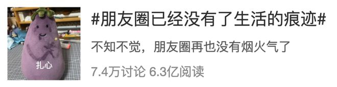 大概说的是朋友圈只剩下驾校招生、教辅招生、租房中介的内容,没人在上面分享生活了。这个词条引起了大家的共鸣,阅读次数 6.3 亿,讨论量 7.4 万。