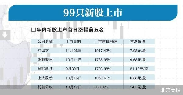 同时,在今年IPO收紧的大环境下,A股新股发行数量较去年同比大降近七成。年内上市新股共99只,其中红四方(603395)以上市首日1917.42%的涨幅位居榜首,公司盘中股价一度涨超2145%。