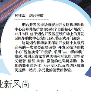 振华集团从未停止对自身产品的精细打磨与迭代革新,此次开发区振华购物中心升级开业,这里将成为集城市旅游集散、城市时尚艺术发布、网红打卡、餐饮休闲、美学生活方案、国际名品购物等多功能于一体的城市游购目的地,将为开发区市民提供更为时尚并关注情绪价值的消费场景,营造暖心的“家门口的幸福生活”。通过持续与城市发展共生、加码年轻力释放蓬勃活力,振华集团用心编织着烟台开发区美好生活。