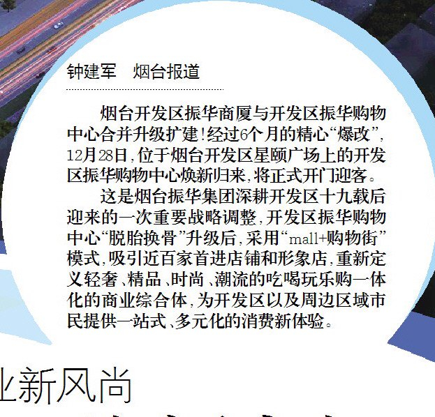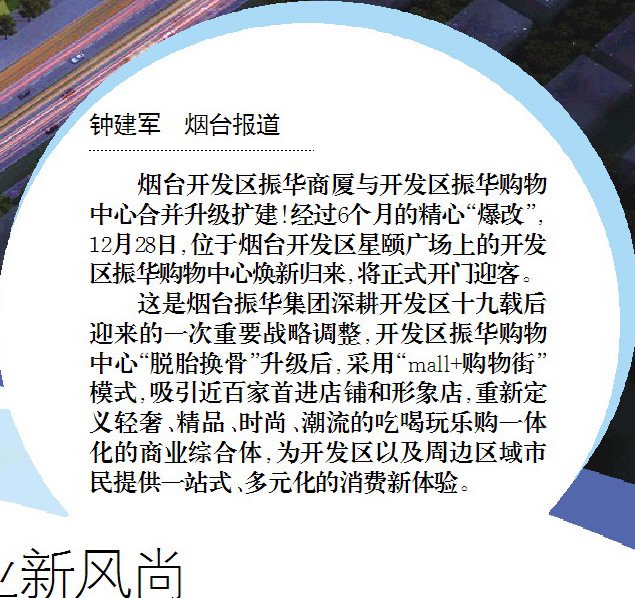 坐落于山东烟台黄渤海新区商业要冲,烟台开发区振华购物中心由蓝图变为现实,将于12月28日盛大开业。
